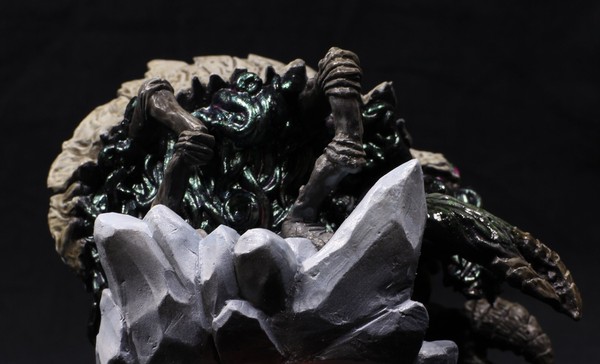 Like the ice, this is mostly naked primer and zenithal highlight. The black neck was done with Warcolours’s gel-based black, which thins and blends well. The top of the head is WTBG. Some Plastic Putty is visible, blended with the final white highlights.