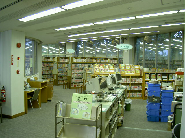 Långt senare samma dag, efter muséet. Jag tog en omväg hem som ledde förbi Hiroshimas kommunala seriebibliotek. Tyvärr stängde det strax innan jag kom fram, men det hindrade inte en utlänning som kunde hävda okunnighet. Jag hann bläddra lite vid en stor hylla med konstsamlingsböcker, bland annat från filmen Arion (1986).