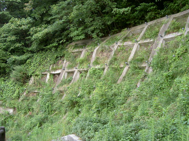 Också taget från stigen nerför kullen. Man ser ofta sådana här artificiella förstärkningar av backar i japansk film. Jag gissar att de är till för att mildra jordbävningar samtidigt som de maximerar mängden plan mark.