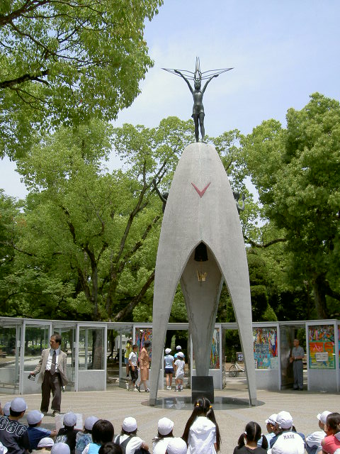 Monumentet är nio meter högt och kröns av en staty av Sasaki Sadako. Hon var två år gammal när bomben small, en och en halv kilometer från hennes hem. Tio år senare dog hon av leukemi. Hon vek papperstranor för att få en önskan uppfylld när sjukdomen upptäcktes, men hann inte samla 1000. Skolklassens papperstranor hängs här in i en av glasmontrarna.