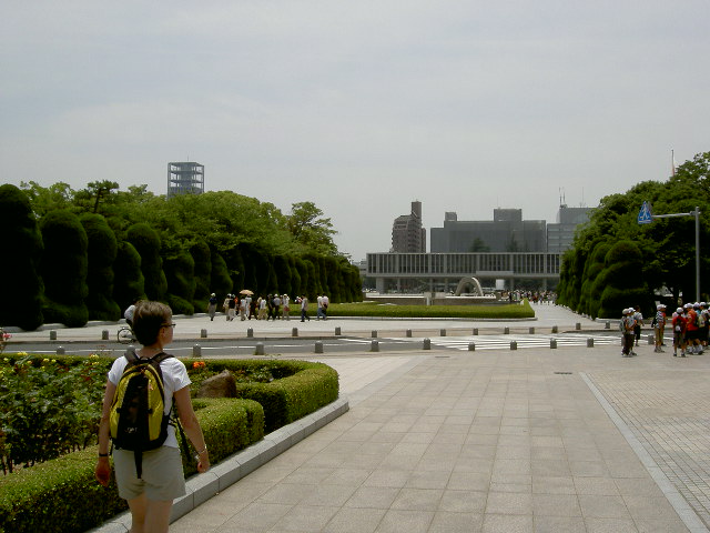 Mor i parken, på väg mot det centrala monumentet. Det omges av träd som klippts så att de ser halvsmälta ut. (Det fanns några träd kvar som faktiskt varit med om smällen och överlevt, men inte dessa. Barken på sidan mot centrum var fortfarande en aning svedd.)