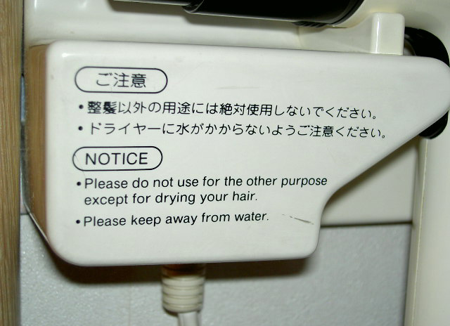 Engrish på ett hårtorksställ. Antydan är att det finns ett uppenbart huvudsyfte med apparaten som inte ens ingår i samma kategori som hårtorkning.