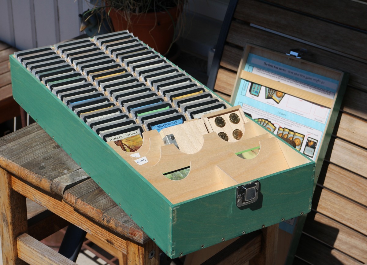All the parts of the storage solution. Copper, randomizers, and a card-sized Trash mat go in the compartments up front, but are not shown here.