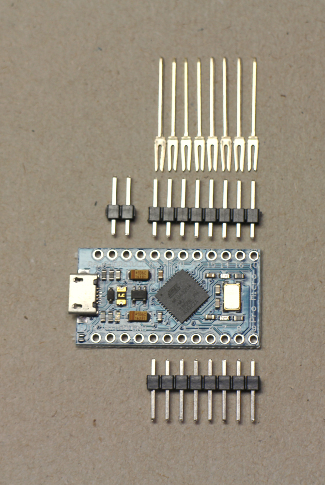 A Pro Micro, three pin headers including 2 pins for an optional reset button, and finally 8 loose forked pins. These can all be soldered together to prepare the MCU for use in a Concertina v0.7.0.