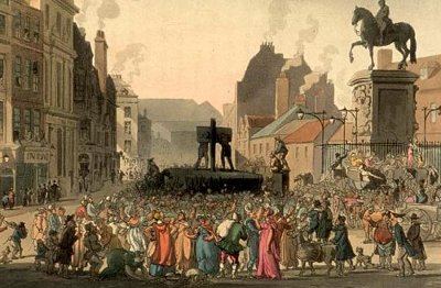 Gravyr i färg av skampåle (pillory) vid Charing Cross 1808, av Augustus Pugin och Thomas Rowlandson för Ackermanns “Microcosm of London” (1808-11).