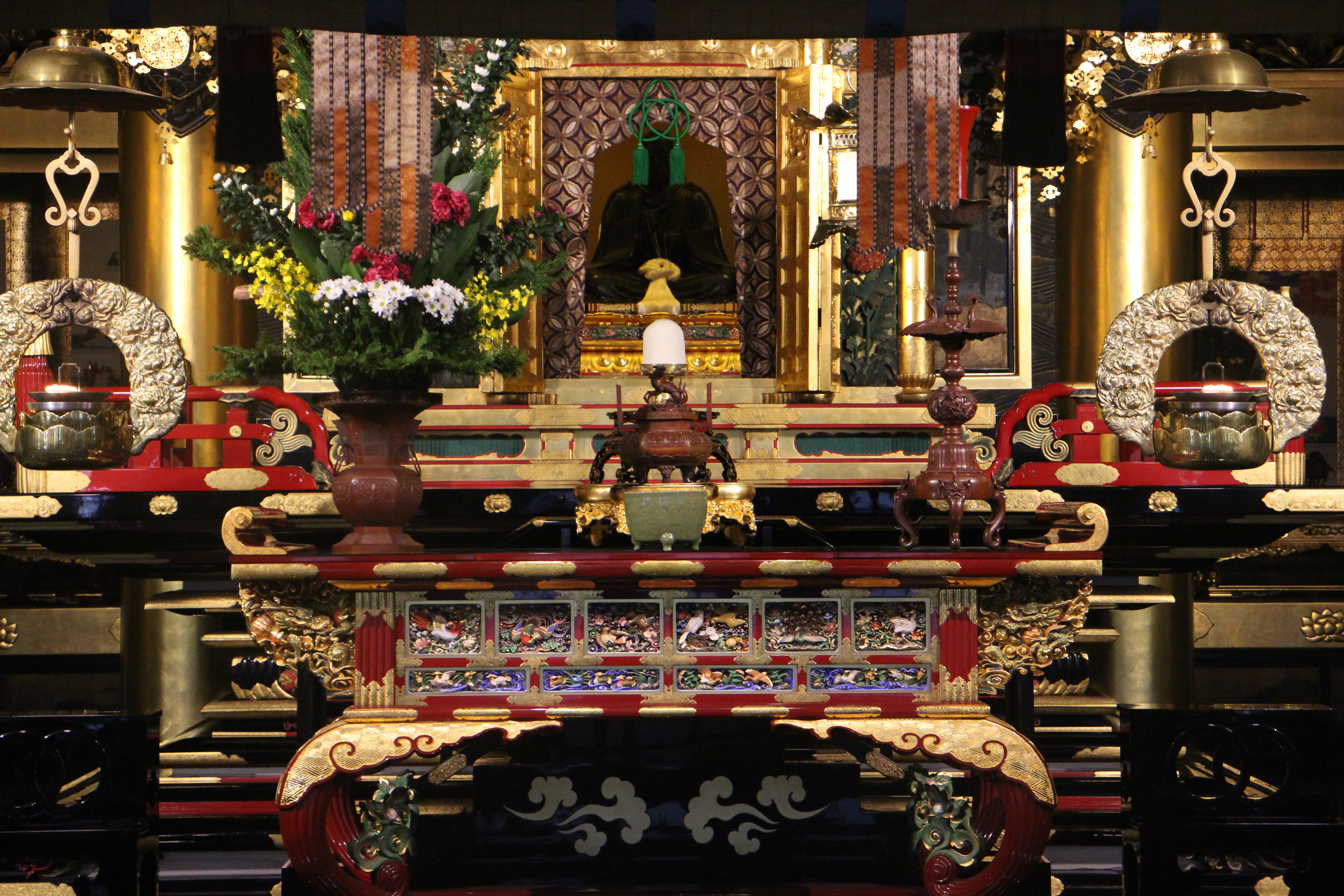 Den mörka figuren längst bak representerar Shinran (1173–1263), grundare av den folkliga Jōdo Shinshū-sekten inom japansk buddhism. Han föddes och dog i det som idag är Kyoto.