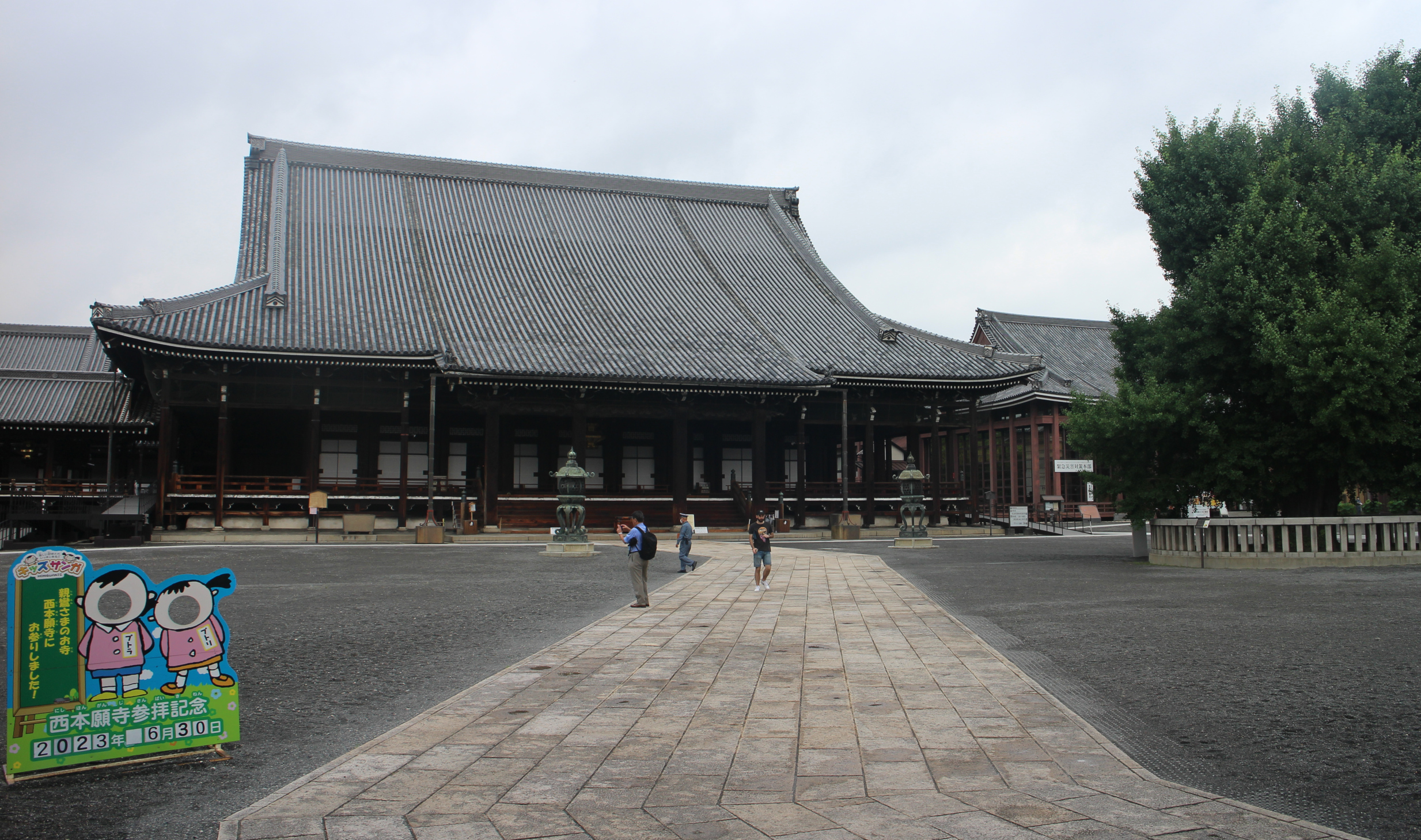Vy genom Amidadōmon till den mindre av templets två stora hallar. Till vänster i förgrunden syns en mall för fotografering av besökande barn, med dagens datum. Texten på grön bakgrund lyder “Vi kom och besökte den ärade Shinrans tempel, Nishi Honganji” (親鸞様のお寺西本願寺にお参りました). Barnen i mallen är templets två maskotar, Putora (från sanskrits putra) och Putori (putri).