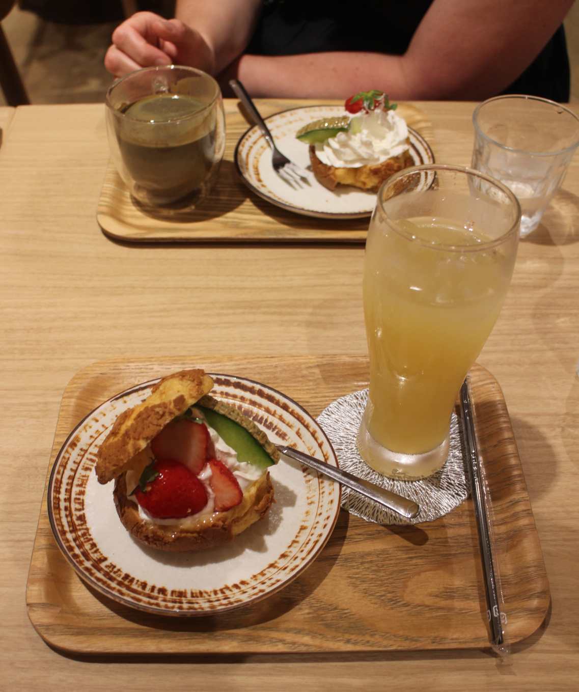 Jordgubbar, en gnutta gelé, en bit melon och något som inte är vispgrädde. Bakelserna kallas shūkurīmu (シュークリーム), härlett från det franska chou à la crème men mer likt det engelska shoe cream (skokräm). Jag fick en känsla av att Minoris målgrupp är flärdfulla unga kvinnor.