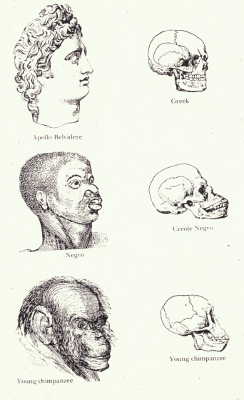 Illustration föreställande “Apollo Belvidere”, en neger och en ung chimpans, från Josiah Clark Nott och George Robert Gliddons Indigenous Races of the Earth (1857).