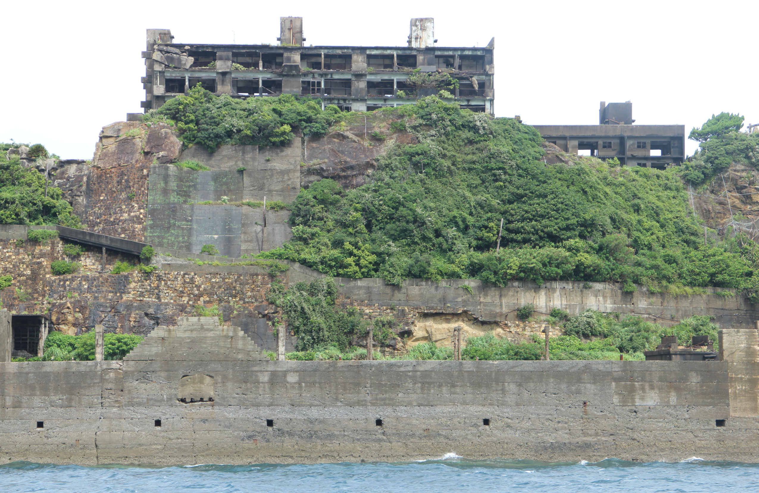 Nummer 3 ligger högst upp på kullen och byggdes 1959 som 20 chefsbostäder med egna bad. I mitten på bilden har murgrönan täckt halva den vägg av stenblock som limmats ihop med karakteristisk röd lera och släckt kalk (amakawa) innan betongens tid. I förgrunden syns smala betongben; på dessa låg ett rullband för kol i själva gruvområdet på öns sydvästra sida.