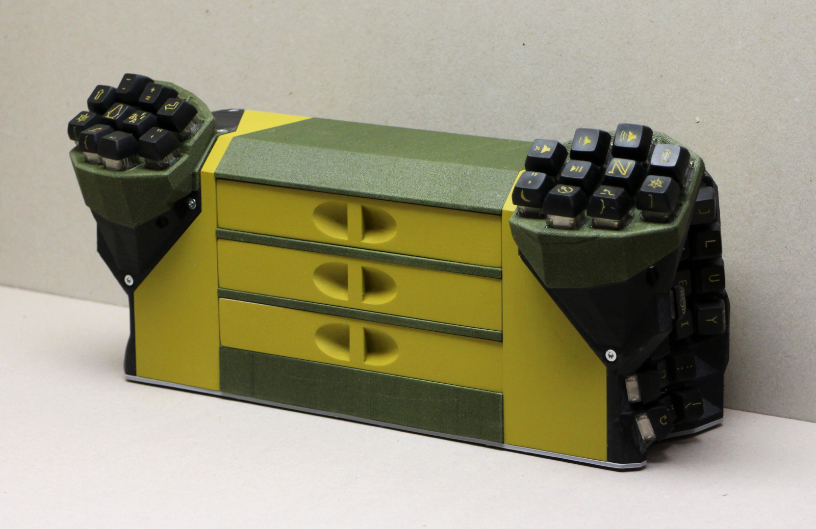 A Concertina built in 2020 as described here. The keycaps shown here were made later, in 2021, to replace the set from 2020.