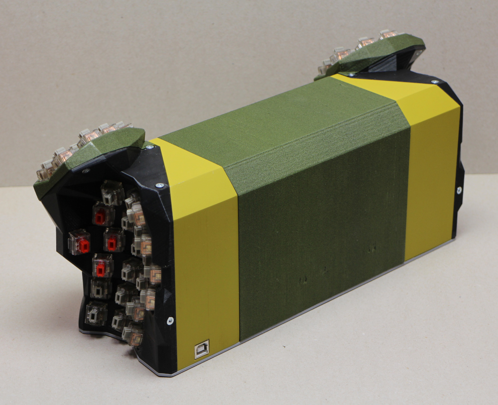 Concertina v0.6.0 complete but for the caps, rear view Rear view of an assembled Concertina case, missing only keycaps. Model from the DMOTE application v0.6.0. In galleries: Build guides Concertina v0.6.0 build-guide illustrationskeyboard