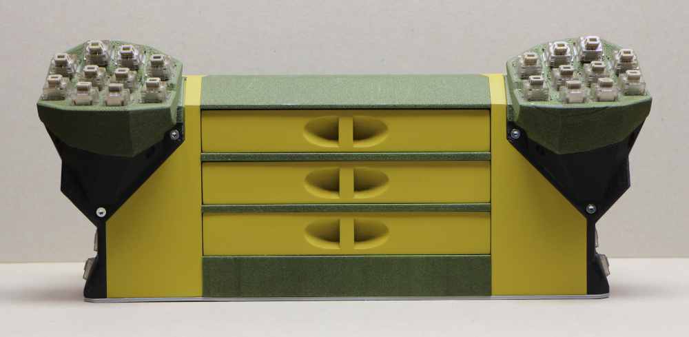 Concertina v0.6.0 complete but for the caps Head-on view of an assembled Concertina case, plus assortment drawers, missing only keycaps. Models from the DMOTE application v0.6.0 and dmote-drawer v0.1.0. In galleries: Build guides Concertina v0.6.0 build-guide illustrationskeyboard
