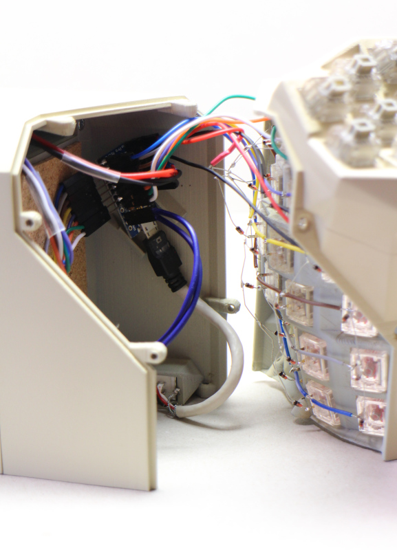 A stage in the assembly of a Concertina v0.7.0. Apart from driving in the last few screws, this is the final stage in building the keyboard case with all its contents, as distinct from the assortment drawers and keycaps that go in still later.