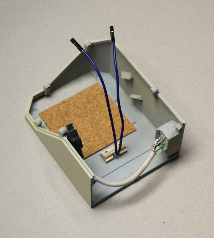 The right-hand bookend of a prototype for the v0.7.0 Concertina, with 2 mm cork glued to the inside to dampen sound, a pushbutton braced by three small pieces of plywood, and a USB port soldered to an internal pigtail cable. For a more comprehensive picture of similar lining for sound, see Concertina v0.6.0 cork lining.