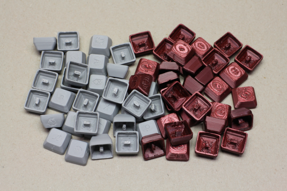 A set of keycaps for a Concertina v0.7.0, as defined by dmote-keycap v0.5.0: This set with supports and brims removed, some of the legends cleaned up by hand, and the grey PLA sanded to a smooth finish. As part of the cleanup process, the fit of each cap on its stem has been checked.