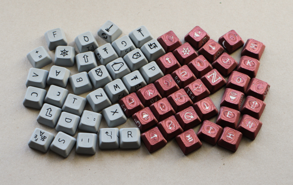 A set of keycaps for a Concertina v0.7.0, as defined by dmote-keycap v0.5.0: This set with printed legends all painted in and varnished by hand, ready for assembly.