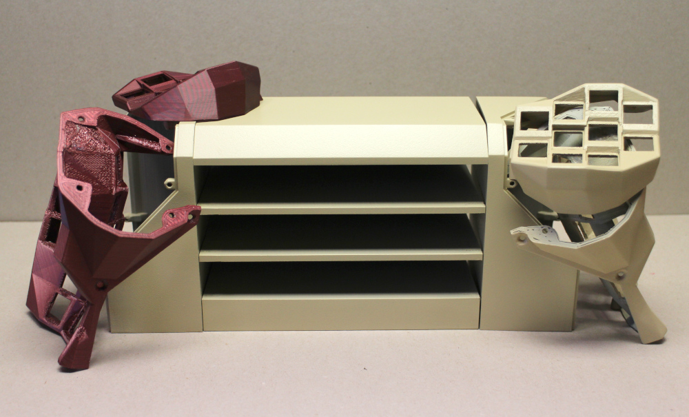 The parts for a Concertina case, with grey exteriors painted and varnished. The burgundy parts are not painted. The paint is two different Vallejo acrylics, both named “Bone White”, applied by airbrush: