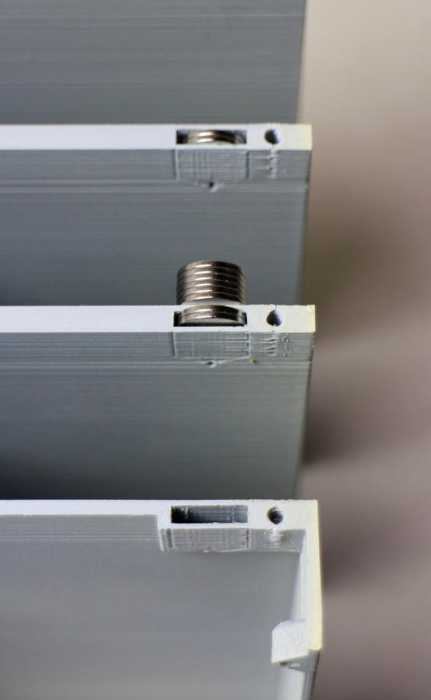 Some 10 mm × 1 mm cylinder magnets being slipped into their pockets in the central housing of a v0.7.0 Concertina. There is no practical need to align the magnetic fields, but a trivial technique for doing so is illustrated here: Move the stack of magnets down each column, slipping off enough to fill each pocket.