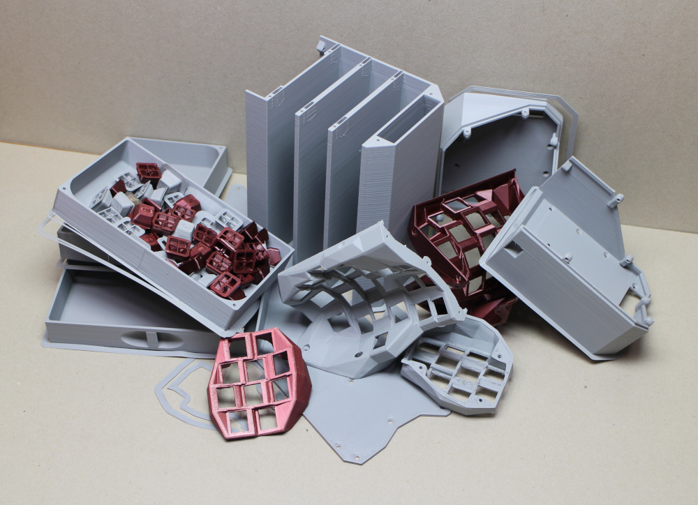 The grey parts are add:north X-PLA and the burgundy parts add:north “Red Metallic” Amphora. You can barely see the first layer of the bottom plate in this picture but it’s the last bit of some brown Renkforce PLA spliced onto the grey.
