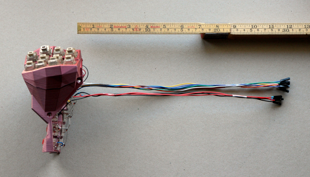 Concertina v0.7.0 routing length The last stage of wiring up the left-hand key clusters. The two bundles have an appropriate length of about 30 cm away from the subassembly body. In galleries: Build guides Concertina v0.7.0 build-guide illustrationskeyboard