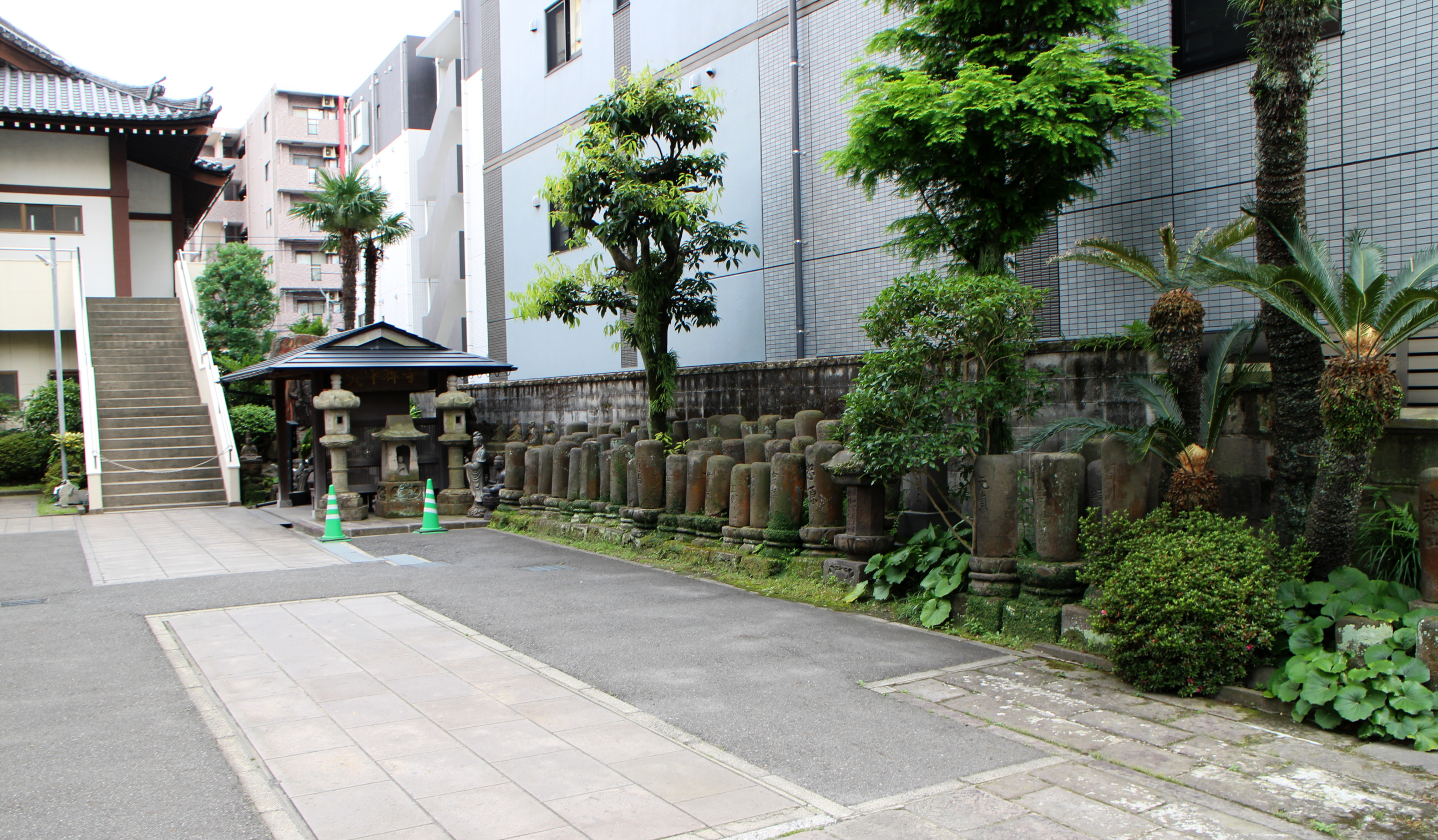 Till vänster i bild syns en del av buddhisttemplet Daichūji (大中寺). Till höger står flera rader symboliska stenar med vackert mossklädda fötter. Jag är nästan säker på att de inte är gravstenar.