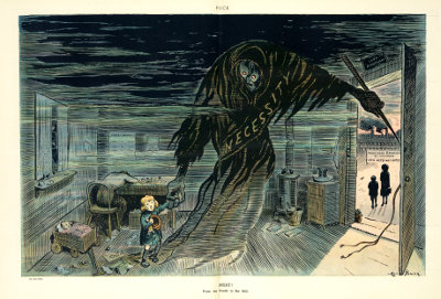 Politisk teckning av Art Young i tidskriften Puck, 10 april 1912: Spöket “Necessity” leder ett barn till fabriken.