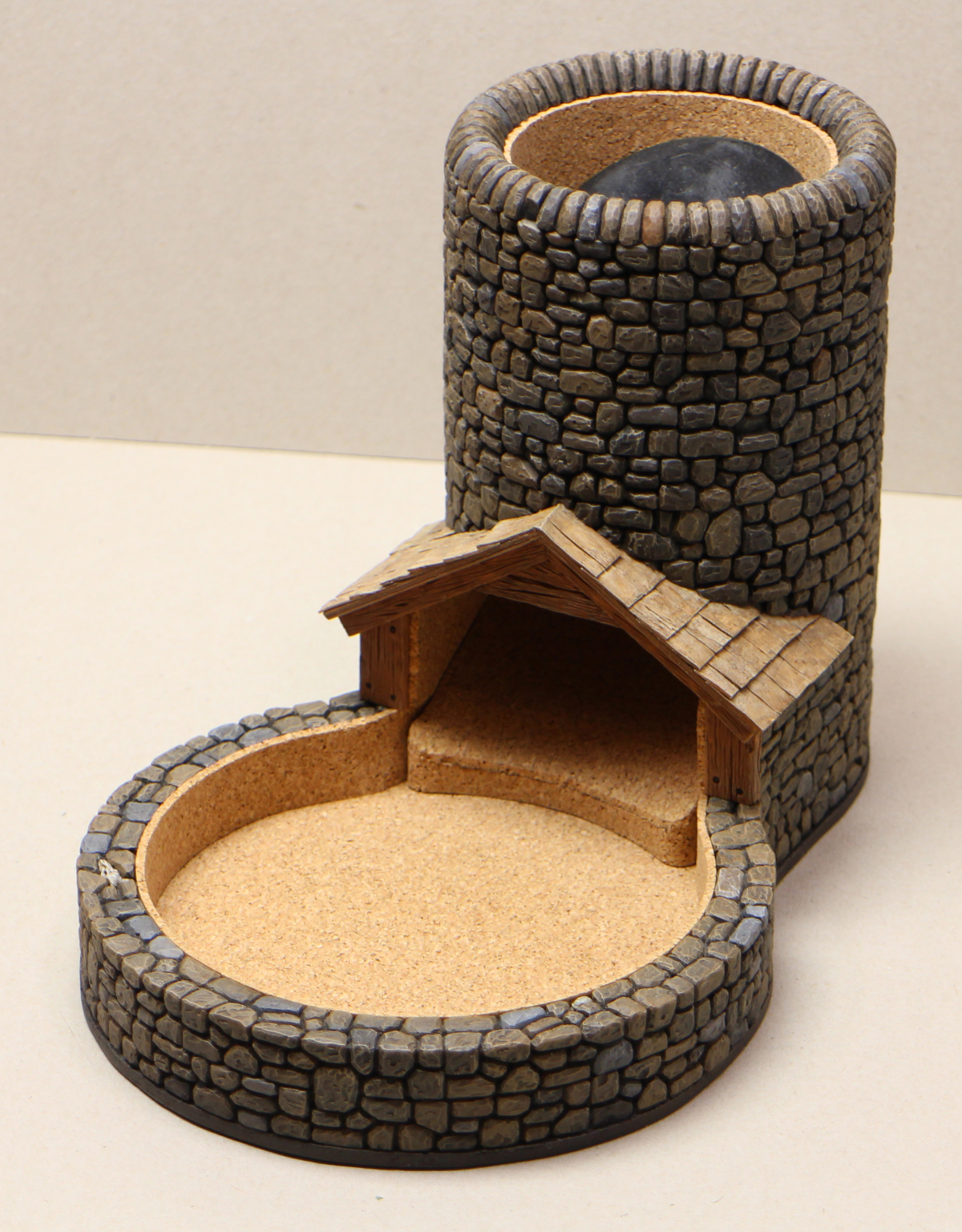 Dice collect in the round basin in front of the dice tower. The outer diameter of the basin is 6”. The tower is 4” around. The total length of the base is 235 mm. Total height: 164 mm.