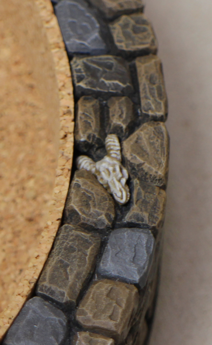 Thinking it would sometimes be interesting to sort dice after rolling them, I divided up the basin into three roughly equal parts by setting two skulls into the fieldstone of the wall and level with it. I have never actually used this feature in the first five years of gaming with this dice tower, but I like how it looks. The skulls—one ram and one human—are from the 2017 Twisting Catacombs Kickstarter by Zealot Miniatures, made of resin.