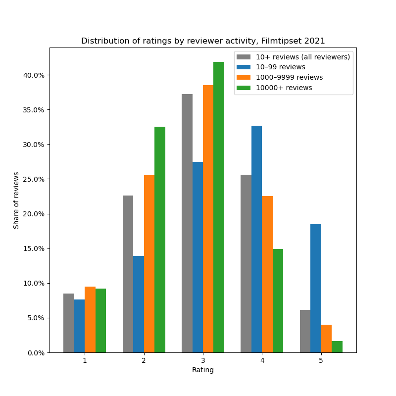 Distribution of ratings by reviewer activity, Filmtipset 2021