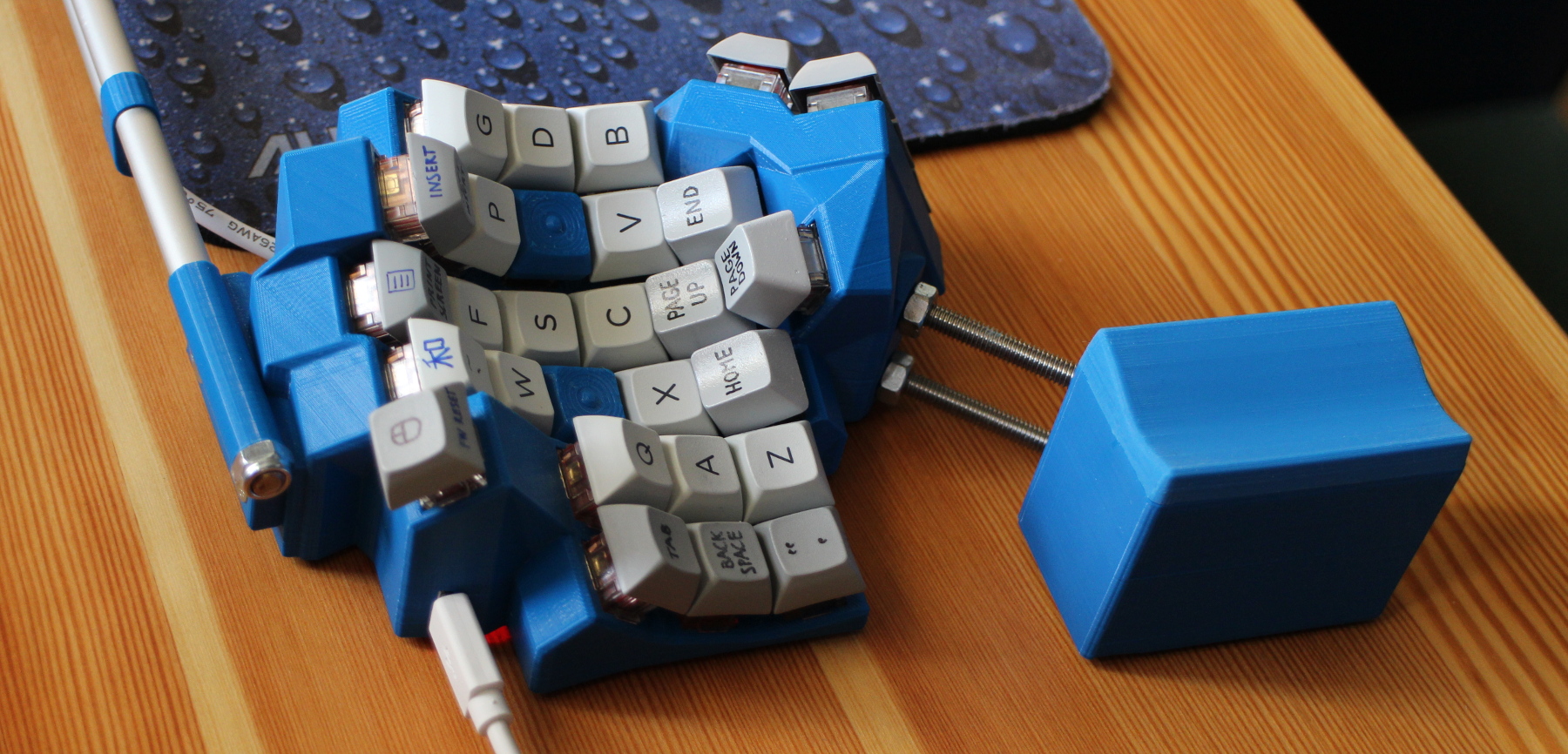Some of the flaws in this early print. The home row (ARST) is so smoothly aligned with the rest that I printed two keycaps with bumps to sense it. For the same reason, there are OEM keycaps, hastily painted the wrong shade of grey, in the navigation cluster.