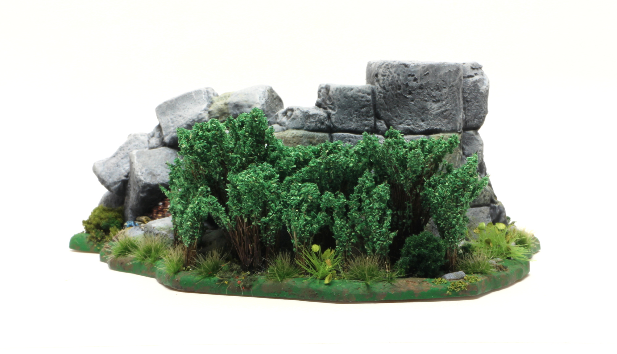 I made the bushes out of bundled fibres, glued together with black PVA at one end, then washed with PVA and brown inks, and finally covered in several layers of Army Painter ”Moss Green” flock.