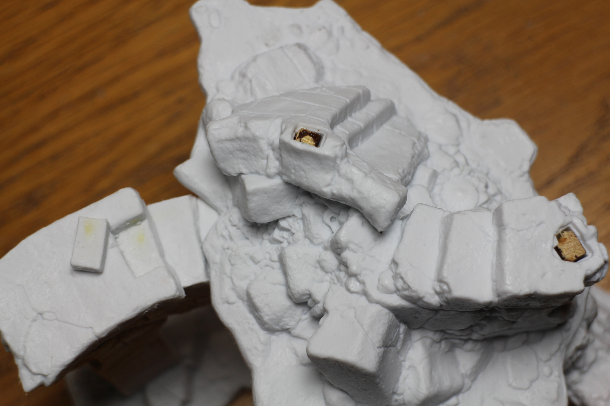 Finally a shot of the small modifications I made to the PVC models. I cut a stone out of the top of the stairs to make them more ergonomic, and filled in the holes where the dragon would have stood with wooden plugs and caulk.