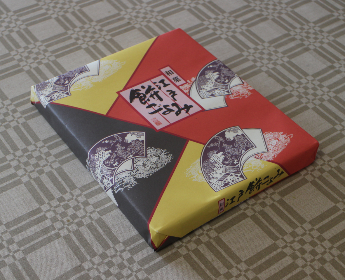 江戸餅ごよみ, en ask med mochi-snacks i Tokyo-stil. Inhandlad på Haneda inför hemresan och uppäten av arbetskamraterna veckan efter.