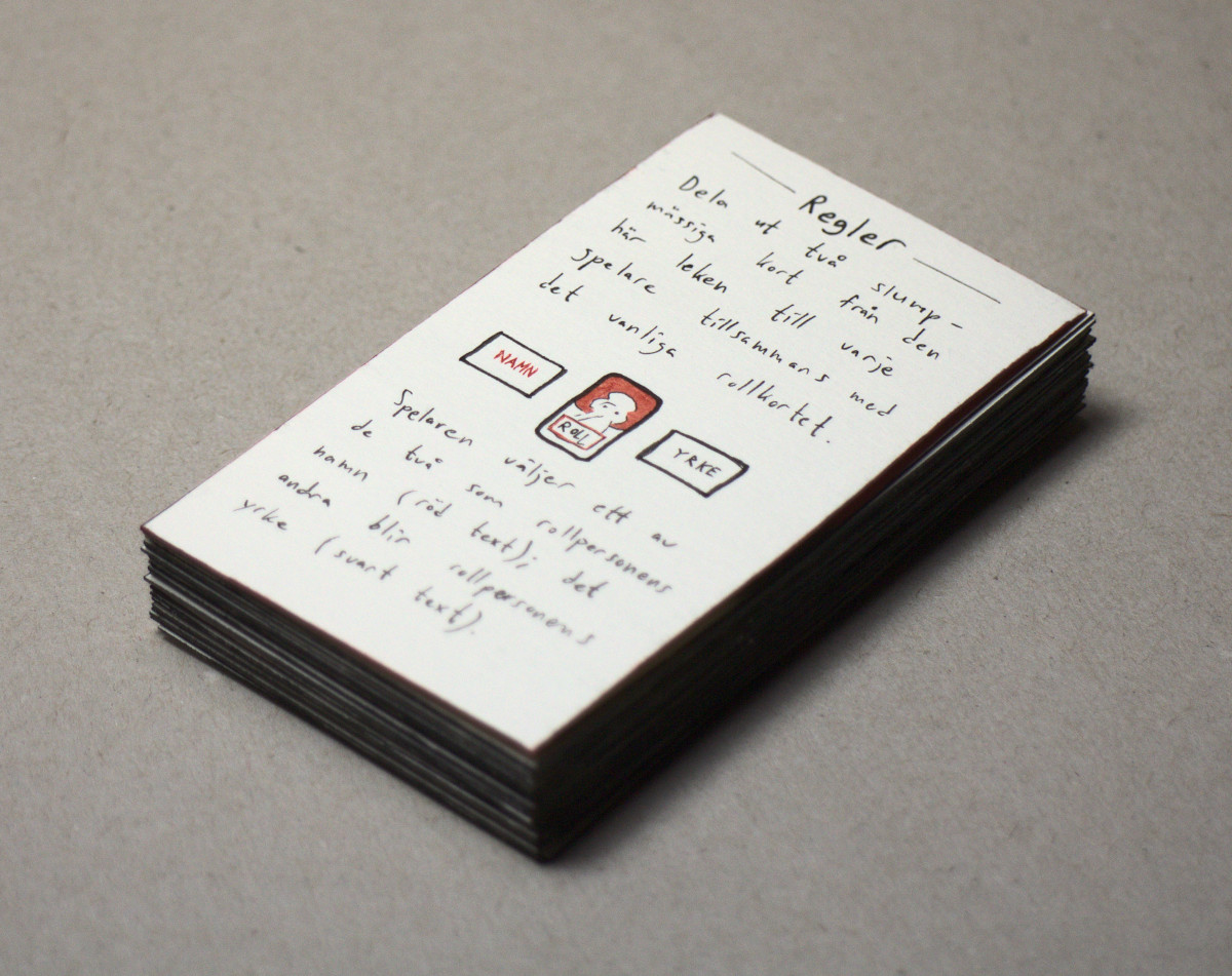 Regelkortet, överst, har rödmarkerade kanter, medan övriga kort har svarta kanter.