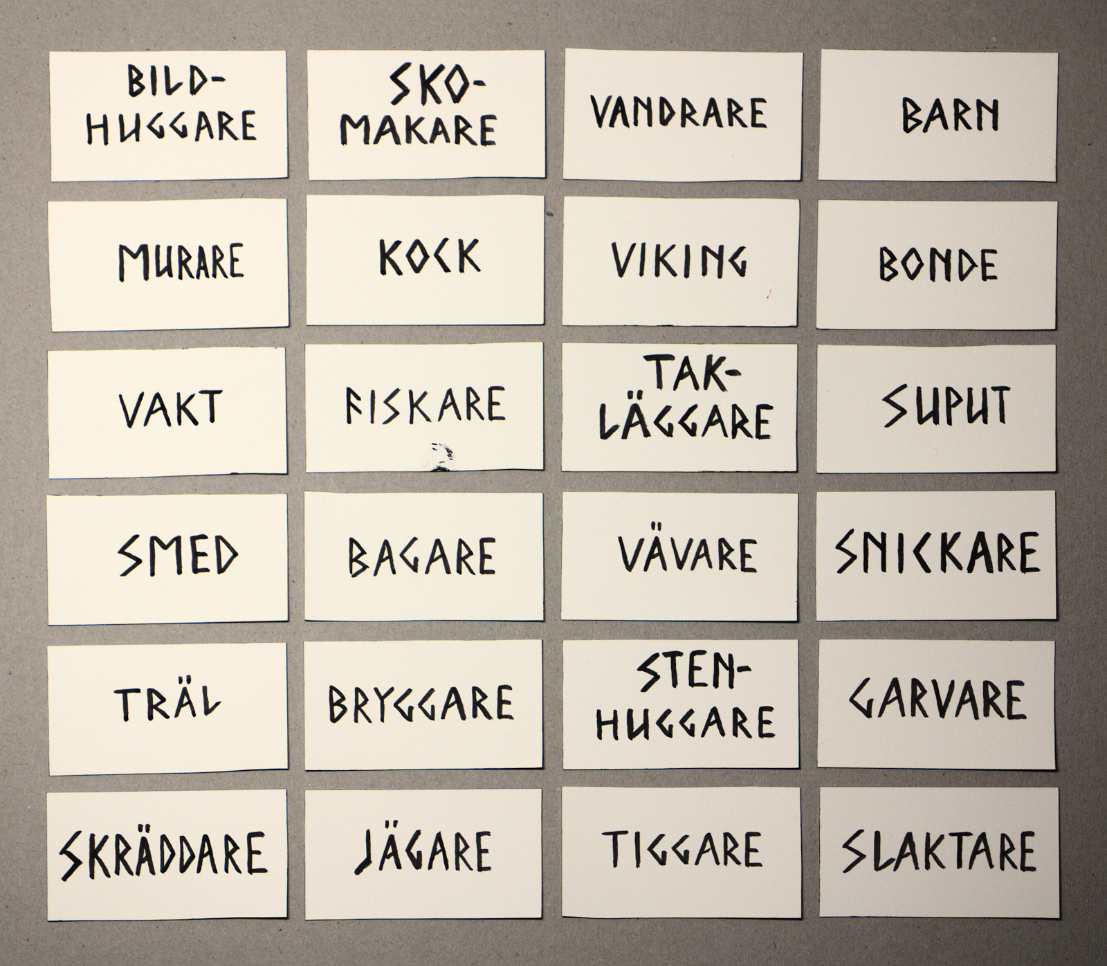 24 vikingatida yrken och motsvarande. Korten är desamma som Expansion till Varulv, namnkort, på samma platser, vända upp och ner.
