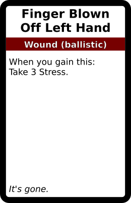 Finger Blown Off Left Hand 1 copy. In galleries: Ballistic Wound deck Horror Cards graphicsTRPG Creative Commons game design Horror Cards