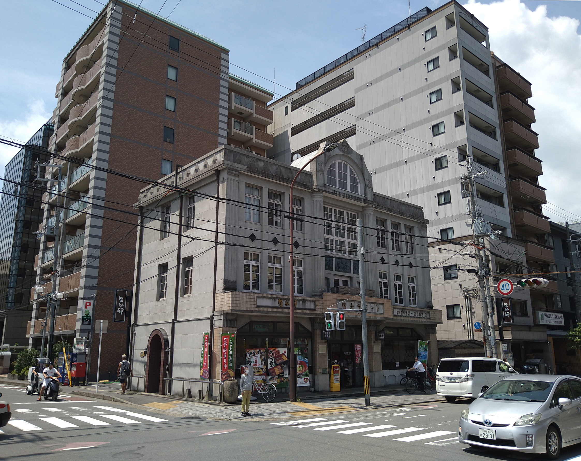 Byggnad på Shimmachi-dōri. Den här är från samma art-deco-era som Shigenobu Kaikan, byggd 1922 av bilfirman Nikkōsha (日光社) i en mer dekorativ västerländsk stil än till exempel Yutaka Sangyō i Kagoshima. Numera ligger en nudelkedja, Nakau, på markplan. Nakau är så utbredd att förändringar av dess menypriser används i riksnyheter som tecken på inflation.