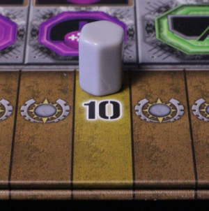 Gaiaprojektet, segerpoängsmarkör på bräde Foto av de grå faktionernas poängmarkör på teknologibrädets segerpoängsspår.