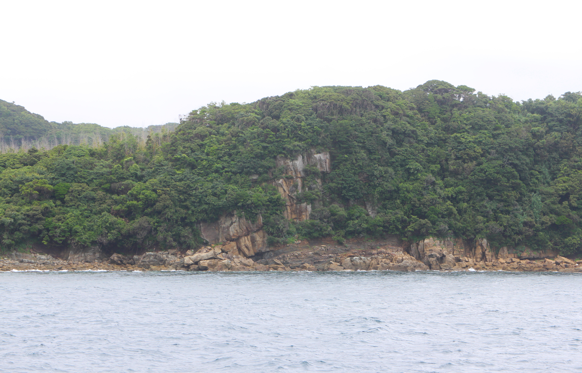 I sundet mellan Kōyagi på fastlandet och bron till Okinojima. Växtligheten binder den varmtonade bergart som användes till de tidiga murarna på Hashima.