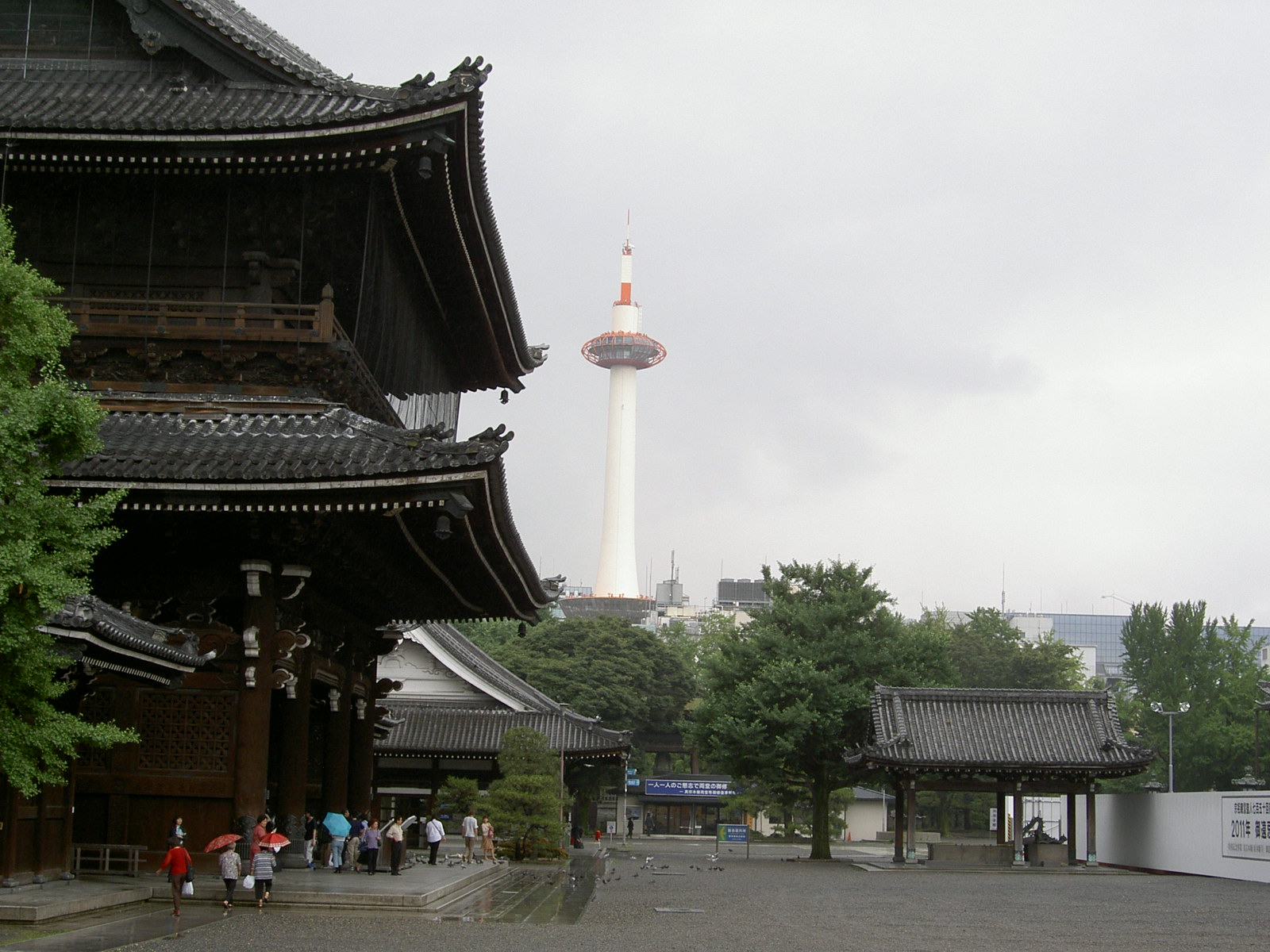 Higashi Honganjis största port inifrån och Kyoto Tower i fjärran.