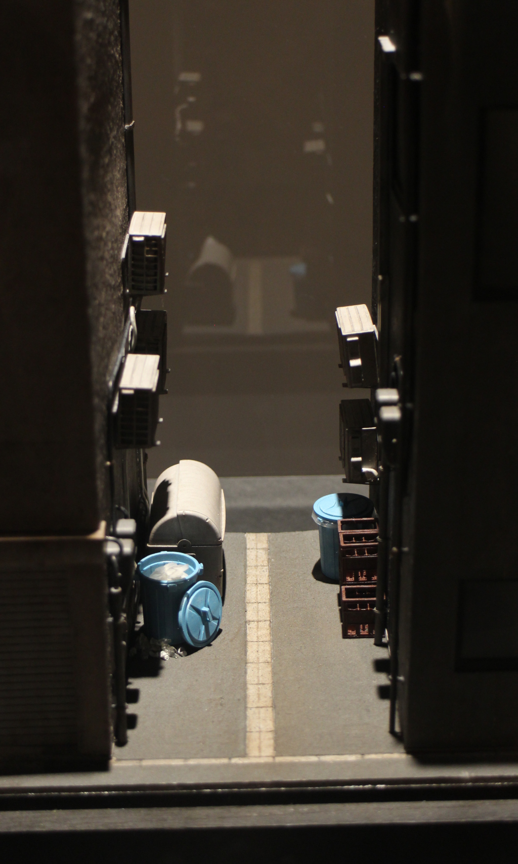 Den här byggde jag för att jag drogs till bakgatornas halvmörker, där AC-aggregat och soptunnor står i en sorg som jag inte har ord för. Vi ser dem inte till vardags, men samlade på bakgatornas skuggor ger de sitt stöd till storstäderna. Jag hoppas att jag kunnat uttrycka något av deras dragningskraft.