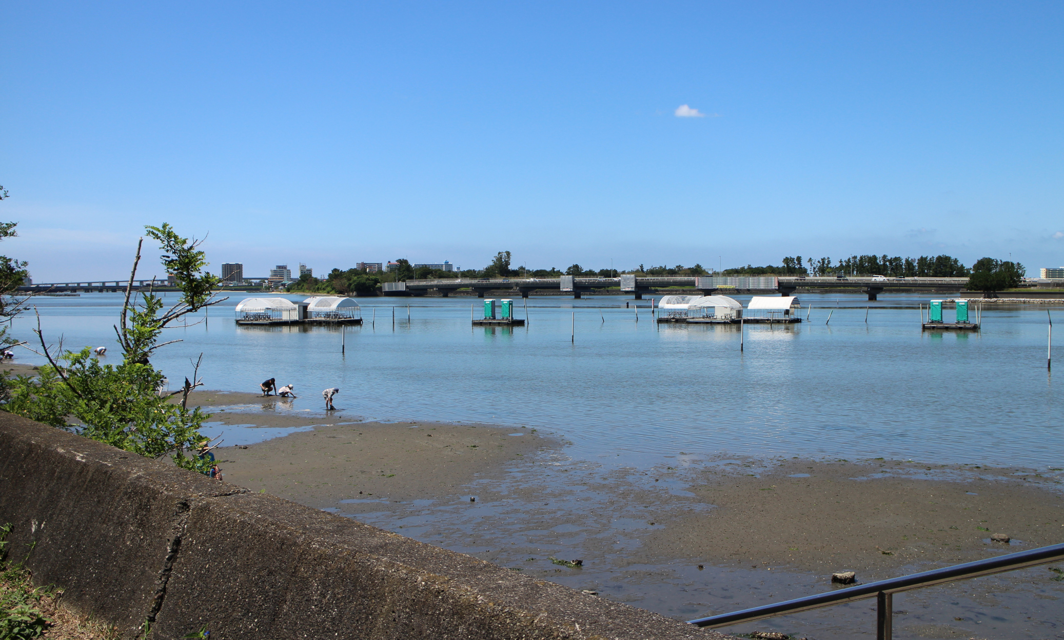 Föräldrar är ute med sina barn på förmiddagen och fiskar i en gren av Hamanako. Solskyddade sittplatser och toaletter flyter mitt ute i vattnet, förtöjda vid pålar.