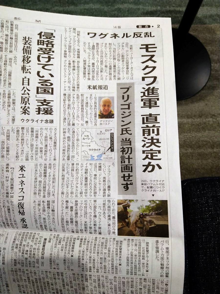Jag missade uppståndelsen kring Wagner-ägaren Jevgenij Prigozjin (1961–2023) när jag var upptagen med att se mig omkring i Japan. Här dyker han upp i en aktad dagstidning som jag försökte läsa i lobbyn på Sōtetsu Frésa.
