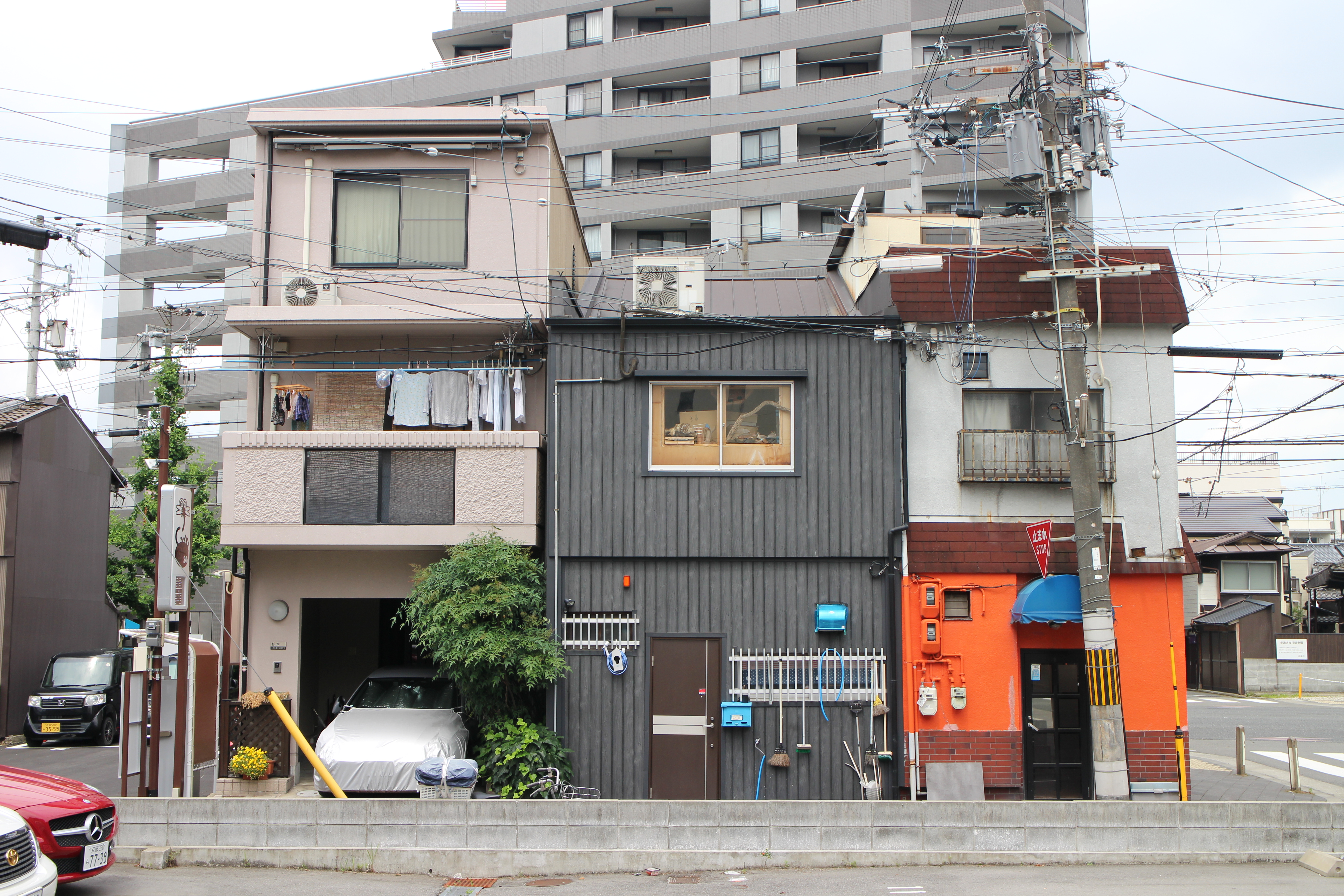 Till vänster en smal villa i tre våningar, där garaget är så kort att bilen måste ha förkläde. Till höger Ichihimes bakdörr, som bara knappt går att öppna bakom elstolpen som fyller luften med kablar.