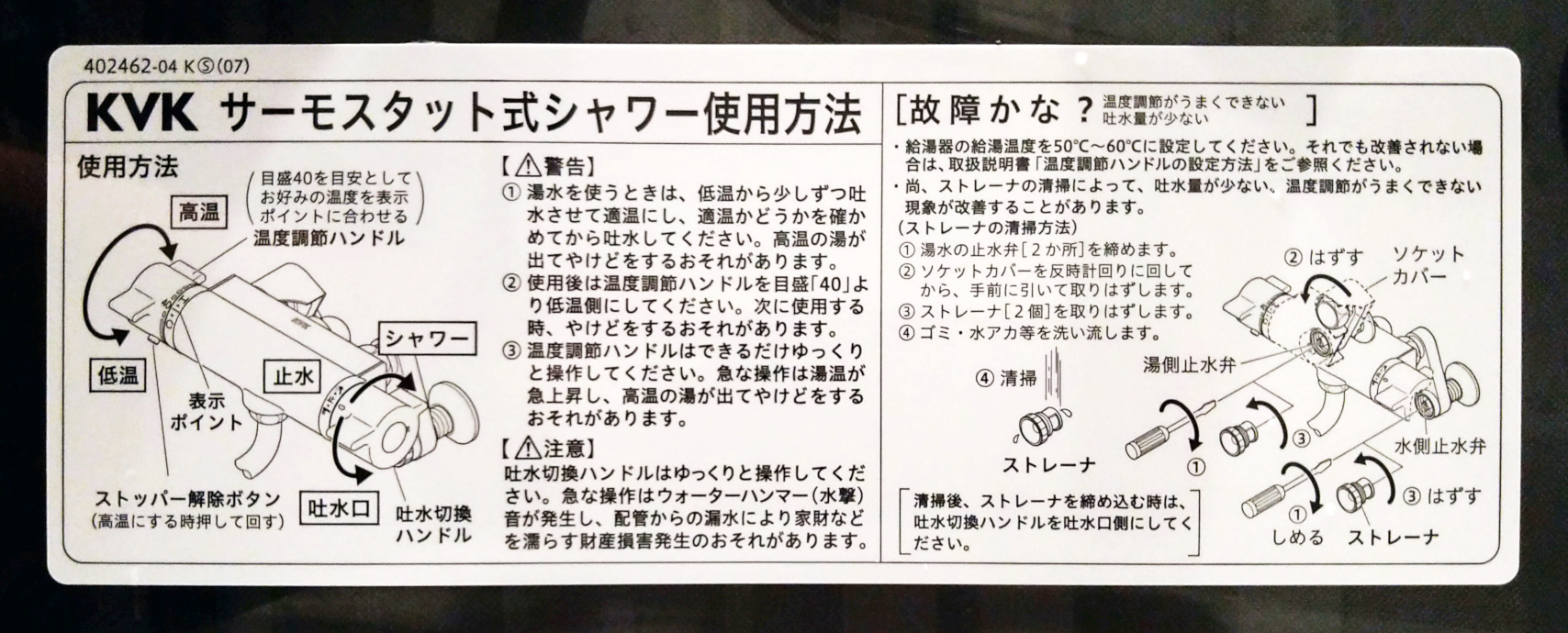“Hur du använder en dusch av termostattyp”. Uppklistrad under blandaren på hotellet Kyōmachi Rikyū Higashi Honganji i Kyoto. Ett fulländat exempel på teknisk illustration och dokumentation för en bred publik. Den högra halvan inleds med rubriken “Undrar om den är trasig?”