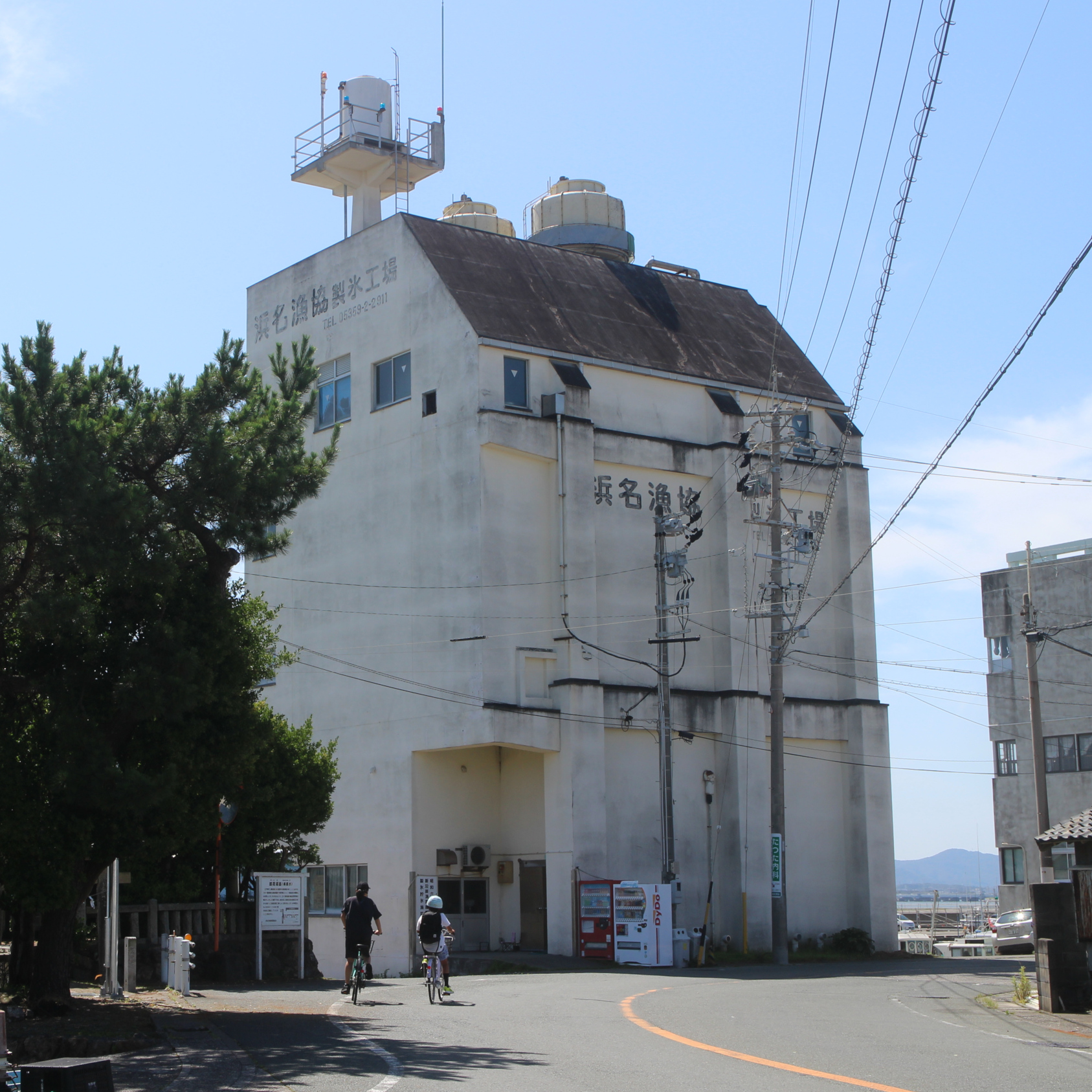 Till vänster Vattenhelgedomen i Maisaka, till höger Hamanas fiskekooperativs isfabrik, som drivs av skrået.