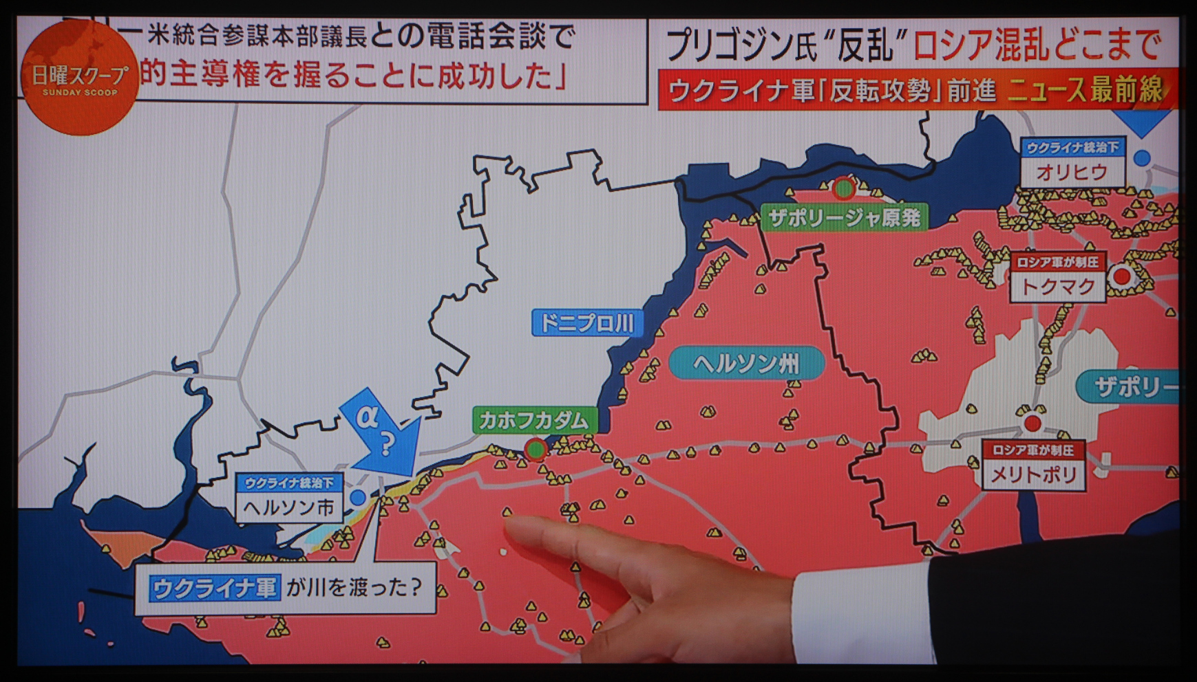 Programmet Söndagsscoopet (日曜スクープ) på satellitkanalen BS朝日 visar, förmodligen för första och sista gången, var Kachovka ligger i södra Ukraina. Experter i studion spekulerade torrt i varför dammen sprängts i ett avlägset land.