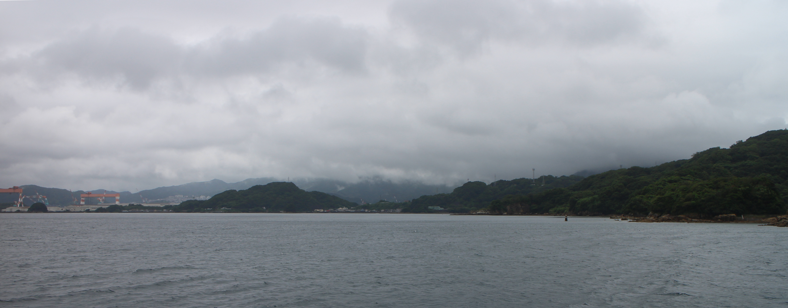 En gnutta bebyggelse ner till Östkinesiska havet. Bakom Kōyagi ligger Mitsubishis varv i Nagasakis yttre hamnområde; de enorma kranarna är synliga till vänster i bild.