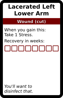 Lacerated Left Lower Arm 1 copy. In galleries: Cut Wound deck Horror Cards graphicsCreative Commons game design TRPG Horror Cards